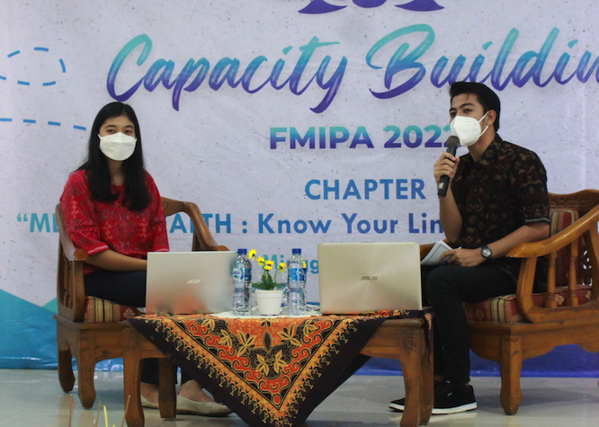 Capacity Building Chapter 1 mengangkat tema  “Mental Health: Know Your Limit Before It Turn Toxic”. Kegiatan ini telah dilaksanakan pada Minggu, 13 Maret 2022 yang bertempat di Ruang Nusantara, Gedung Agrokompleks Lantai 4, Kampus Unud Sudirman dan diikuti oleh 223 orang mahasiswa aktif FMIPA Universitas Udayana.