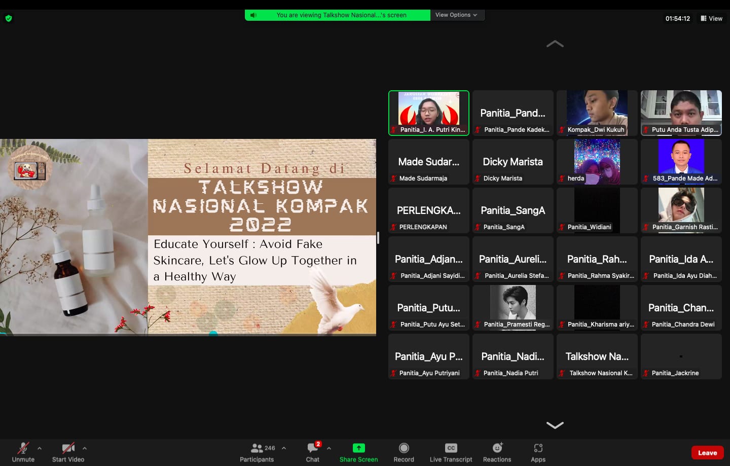Komunitas Mahasiswa Peduli Kanker Fakultas Kedokteran Universitas Udayana menyelenggarakan kegiatan Talkshow Nasional 2022 secara online via Zoom Meetings (11/6/2022). Kegiatan yang mengangkat tema “#Educateyourself : Avoid Fake Skincare, Let’s Glow Up Together in a Healty Way” ini diselenggarakan dengan tujuan memberikan informasi dan pemahaman mengenai kanker kulit.