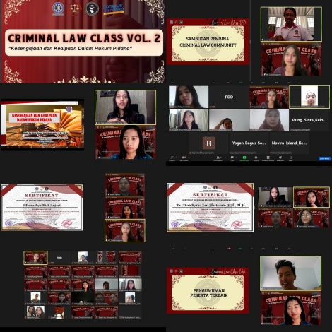 Criminal Law Class Vol. 2 yang diselenggarakan oleh komunitas mahasiswa FH Unud yang tergabung dalam Criminal Law Community (CLC) berlangsung pada Sabtu (5/11/2022). Kegiatan ini merupakan lanjutan dari Criminal Law Class sebelumnya (Vol. I) yang bertujuan untuk memberikan pengetahuan dasar hukum pidana mengenai kesengajaan dan kealpaan yang tentunya akan menambah wawasan serta dapat mengembangkan pola berfikir secara kritis saat menganalisa kasus-kasus hukum yang terjadi di masyarakat.
