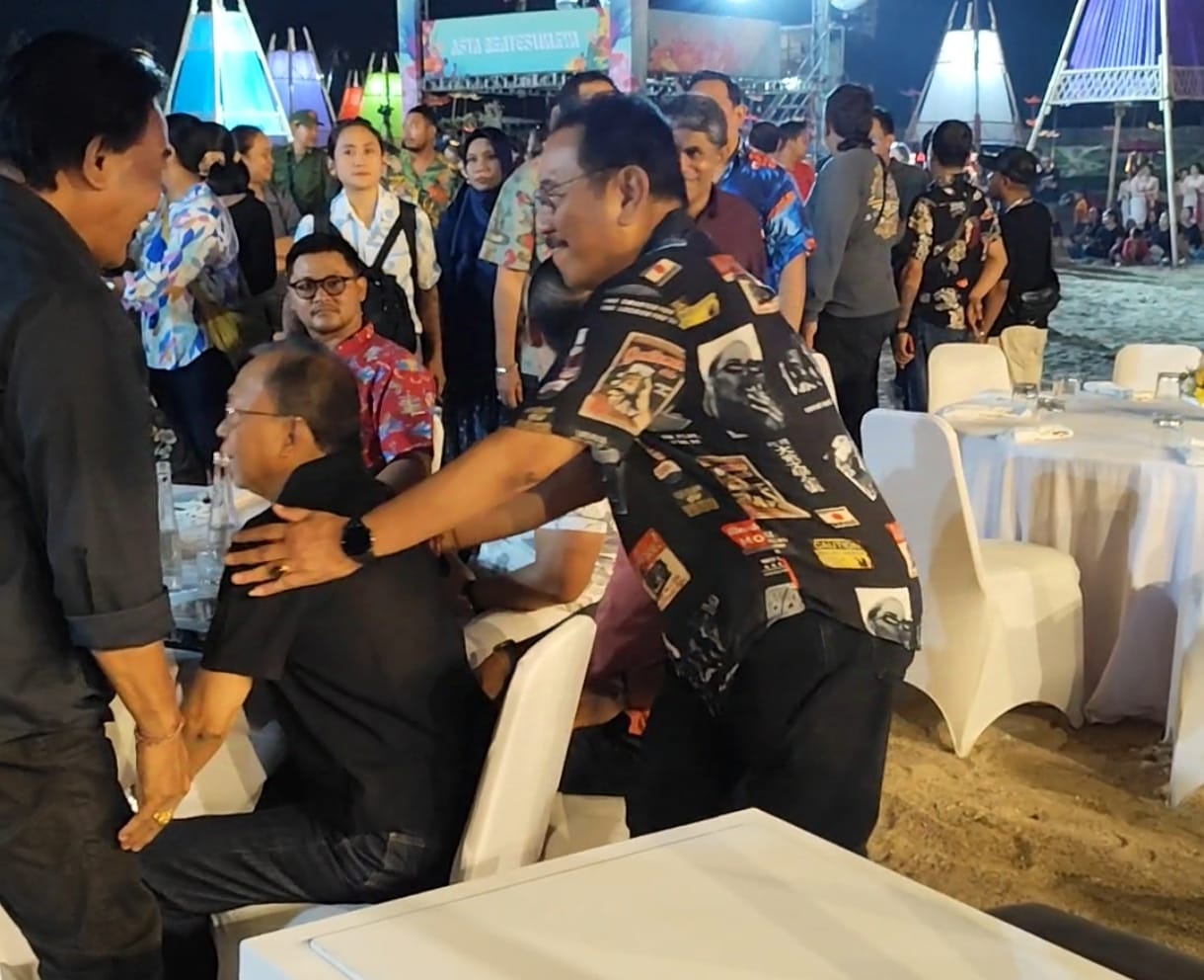 KEJUTKAN KOSTER – Mantan Wagub Cok Ace mengejutkan Cagub Bali Wayan Koster saat menghadiri SVF Ke-17 di Pantai Mertasari Sanur, Rabu (16/10/2024).