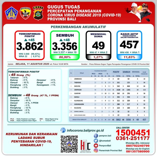 Gugus Tugas Percepatan Penanganan Covid-19 Provinsi Bali menyampaikan perkembangan Penanganan corona virus disease (covid-19) di Provinsi Bali per Selasa (11/8/2020). Jumlah kumulatif pasien positif 3.862 (bertambah 45 transmisi lokal).