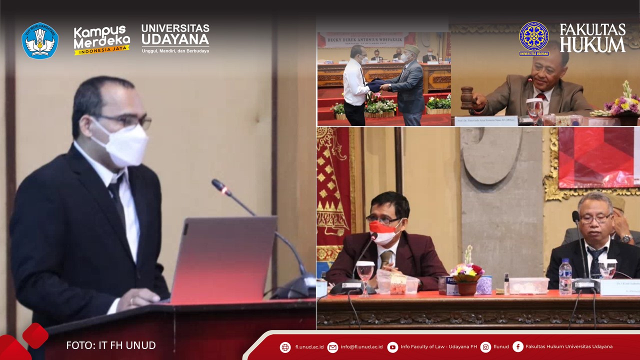 Sidang promosi doktor yang berlangsung selama 2 jam dipimpin langsung oleh Dekan FH Unud Prof. Dr. Putu Gede Arya Sumerta Yasa, S.H.,M.Hum, didampingi oleh Promotor Prof. Dr. I Putu Sudarma Sumadi, S.H., S.U., Ko-Promotor I Dr. I Ketut Sudantra, S.H., M.H., Ko-Promotor II Dr. Gede Marhaendra Wija Atmaja, S.H., M.Hum., serta 4 dewan penguji/penyanggah lainnya.