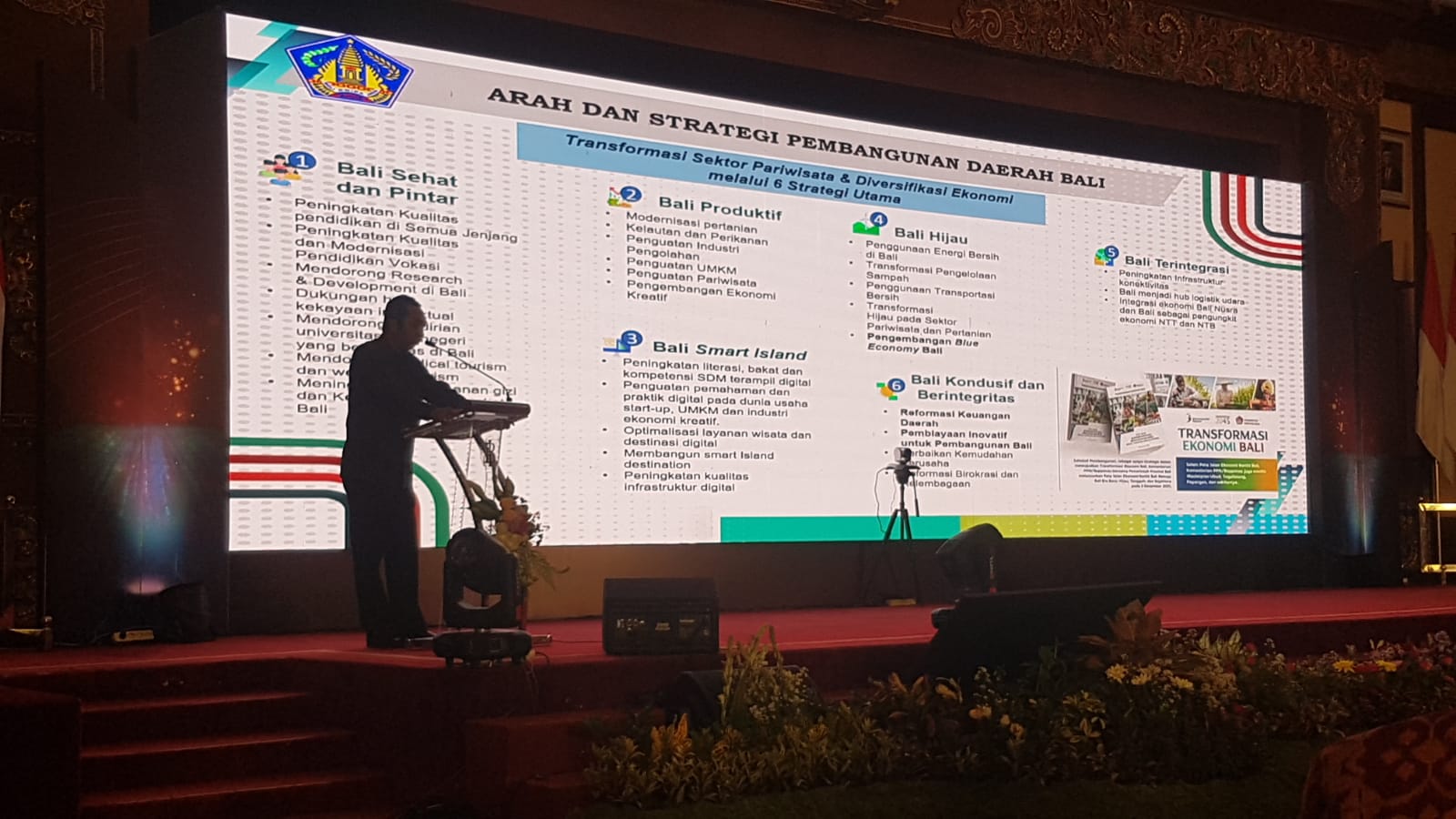 PEREKONOMIAN BALI – Kepala Bappeda Bali Wayan Wiasthana Ika Putra memaparkan kondisi perekonomian Bali serta strategi yang dilakukan dalam Pertemuan Tahunan BI, Rabu (29/11/2023).