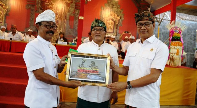 Dalam kesempatan ini Bupati Giri Prasta bersama Wabup. Suiasa menyerahkan secara simbolis Bantuan Pemerintah Kabupaten Badung untuk karya Pitra Yadnya dan Manusa Yadnya Desa Adat Kwanji Rp. 1 Miliar.