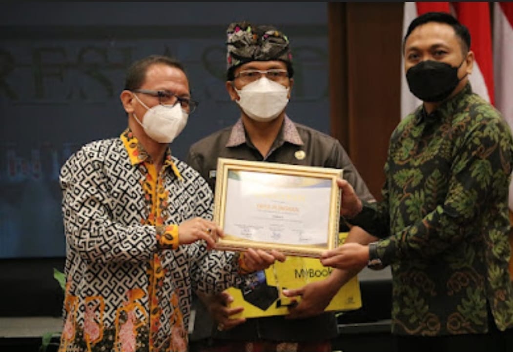 PENGHARGAAN – Kepala Desa Punggul Kadek Sukarma menerima penghargaan yang diserahkan langsung oleh Ketua Komisi Informasi Pusat Gede Narayana di Hall Nusantara Ice BSD Tangerang Selatan, Selasa (28/9).
