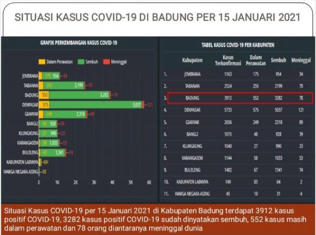 Pada Jumat (15/1/2021), hari ini ada tambahan 95 kasus positif/konfirmasi sehingga total kumulatif kasus positif/konfirmasi covid-19 di Kabupaten Badung kini menjadi 3.912 orang. Hal ini diungkapkan Koordinator Kehumasan Gugus Tugas Percepatan Penanganan Covid-19 Badung GN Jaya Saputra.