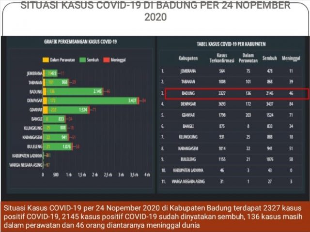 Pada Selasa (24/11/2020), ada tambahan 12 kasus positif/konfirmasi sehingga total kumulatif kasus positif/konfirmasi Covid-19 di Kabupaten Badung kini menjadi 2.327 orang. Hal ini diungkapkan Koordinator Kehumasan Gugus Tugas Percepatan Penanganan Covid-19 Badung GN Jaya Saputra.