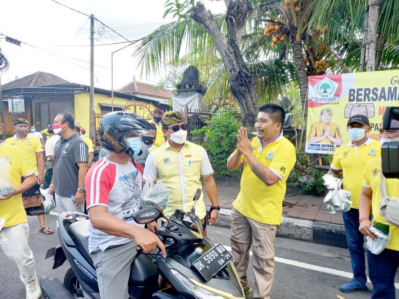 GOLKAR – Ketua DPD Partai Golkar Kabupaten Badung, Wayan Suyasa didampingi Ketua Pimpinan Kecamatan (PK) Partai Golkar Mengwi, Made Suda bersama sejumlah pengurus, kader serta simpatisan membagikan nasi bungkus gratis untuk masyarakat.