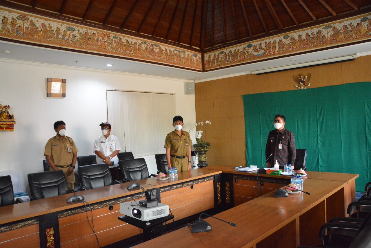 PEMBEKALAN – Wawali I Kadek Agus Arya Wibawa saat mengikuti pembekalan Pemerintah Dalam Negeri secara tatap maya di Kantor Wali Kota Denpasar yang didampingi OPD terkait, Senin (14/6).