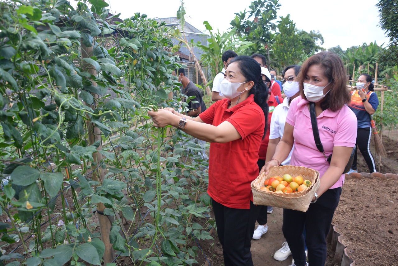Ketua Tim Penggerak PKK Kota Denpasar, Ny. Sagung Antari Jaya Negara melaksanakan panen sayur bersama kelompok Pekarangan Pangan Lestari (P2L) Desa Sumerta Kelod, Kecamatan Denpasar Timur, Jumat (20/8/2021) di Kelompok Tani Empelan Terbin.