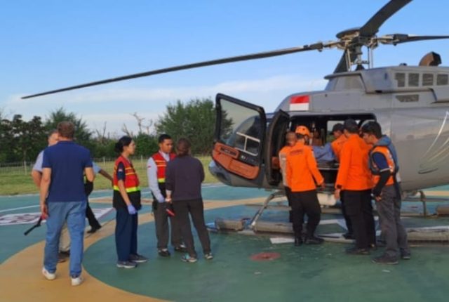 GUNAKAN HELI – Pendaki Swiss dievakuasi menggunakan pesawat helikopter setelah terjatuh di Gunung Rinjani.