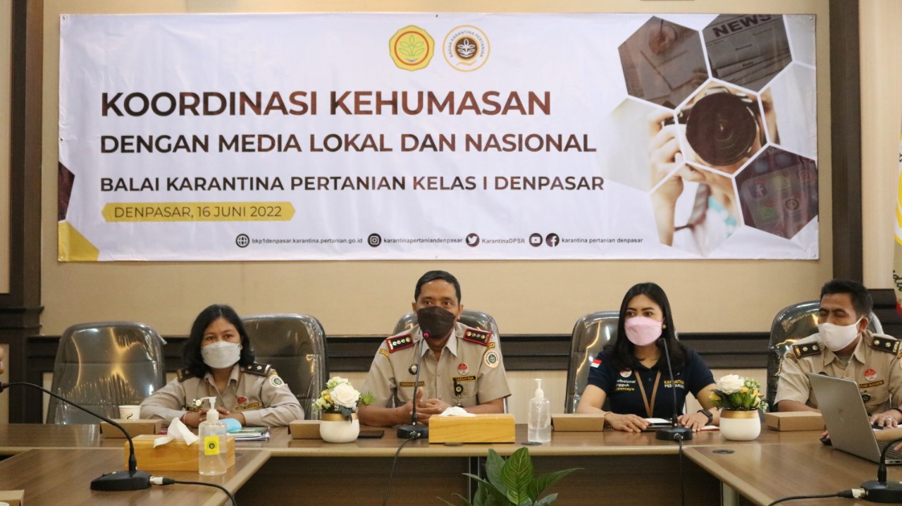 KEHUMASAN – Kepala Balai Karantina Pertanian Kelas 1 Denpasar Putu Terunanegara menggelar koordinasi kehumasan dengan media, Kamis (16/6/2022).