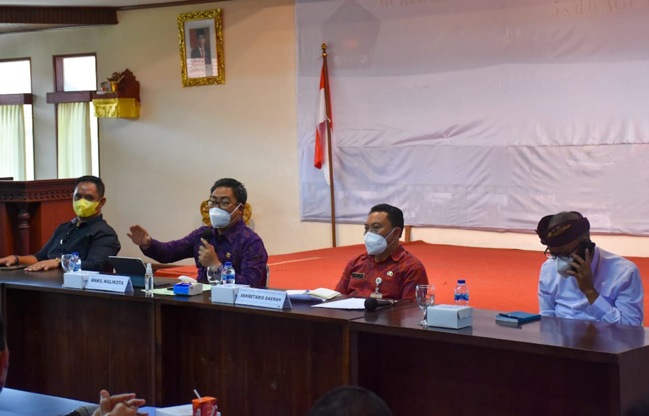 PROYEK – Wakil Walikota Denpasar, I Kadek Agus Arya Wibawa saat memimpin pelaksanaan sosialisasi proyek penataan Kawasan Pantai Sanur di Yayasan Pembangunan Sanur Denpasar, Selasa (28/9).