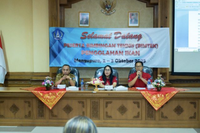 Guna meningkatkan wawasan, pengetahuan dan keterampilan bagi pelaku usaha perikanan, Dinas Perikanan Kabupaten Badung menggelar kegiatan Bimbingan Teknis (Bimtek) Pengolahan Ikan dengan mengambil tema “Melalui Bimbingan Teknis Pengolahan Ikan Bagi Pelaku Usaha Perikanan, Kita Tingkatkan Mutu Produksi Hasil Perikanan di Kabupaten Badung Tahun 2023”. Acara Bimtek yang dibuka oleh Ketua TP PKK Badung dalam kesempatan ini diwakili oleh Wakil Ketua I TP PKK Badung Ny. Kristiani Suiasa diikuti oleh 35 peserta terdiri atas unsur perwakilan pelaku usaha perikanan kelompok pengolah dan pemasar ikan, unsur Tim Penggerak PKK (TP PKK) dan unsur Dinas Perikanan Kabupaten Badung serta OPD terkait di lingkungan Pemerintah Kabupaten Badung dan dilaksanakan di Ruang Rapat Lantai II Dinas Perikanan Kabupaten Badung, Senin (2/10).