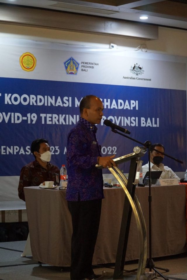 Untuk mendapatkan gambaran yang komprehensif terhadap kondisi penanganan covid18 Provinsi Bali saat ini, Dinas Kesehatan Provinsi Bali bersama Australia Indonesia Health Security Partnership (AIHSP) mengundang beberapa narasumber dari pemerintah pusat yakni Kementerian Kesehatan, dari pemerintah daerah yakni Bappeda Provinsi Bali, Perhimpunan Ahli Epidemiologi Indonesia – Cabang Bali, dan Ketua Forum Komunikasi Risiko One Health Provinsi Bali.