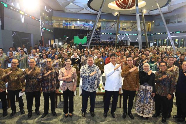 Peluncuran PINTAR Reksa Dana dilakukan Ketua Dewan Komisioner OJK Friderica Wisyasari Dewi bersama Menko Perekonomian Airlangga Hartarto dan Menteri Keuangan Purbaya Yudhi Sadewa di Main Hall Bursa Efek Indonesia, Senin (27/4/2026).