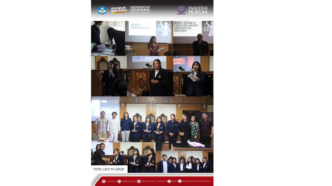 Kegiatan Pilmapres FH Unud Tahun 2023 diawali dengan laporan Ketua LSCC FH Unud Ida Ayu Kade Febriyana Dharmayanti dan dibuka oleh Dr. I Made Sarjana, SH, MH selaku Wakil Dekan III FH Unud. Adapun 6 peserta mahasiswa dan melibatkan 5 orang juri dari unsur dosen FH Unud serta Pembina LSCC FH Unud sebagai pendamping kegiatan. Pilmapres menggunakan 3 indikator penilaian utama, yakni penilaian atas capaian unggulan berupa prestasi yang diraih peserta, gagasan kreatif, dan kemampuan berbahasa Inggris dengan bobot masing-masing sesuai Pedoman Pilmapres Tingkat Nasional. Dari hasil penilaian, diperoleh 3 nilai tertinggi yang diraih oleh Ni Kadek Ayu Sri Undari (Angkatan 2020) dengan nilai total 441, sebagai Mahasiswa Berprestasi FH Unud 2023. Cokorda Istri Kirana Pramesti (Angkatan 2020) dengan nilai total 398, sebagai Runner Up I Mahasiswa Berprestasi FH Unud 2023. Ni Ketut Devi Damayanti (Angkatan 2020) dengan nilai total 378, Runner UP II Mahasiswa Berprestasi FH Unud 2023.