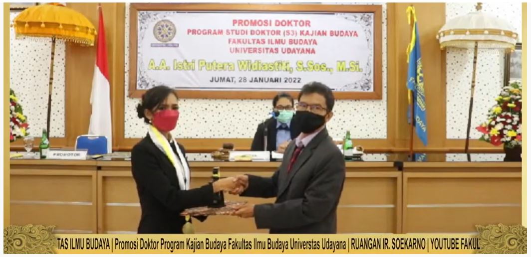Program Studi Doktor (S3) Kajian Budaya, Fakultas Ilmu Budaya (FIB), Universitas Udayana kembali menyelenggarakan Promosi Doktor dengan promovenda AA Istri Putera Widiastiti, S.Sos., M.Si. Promosi Doktor dilaksanakan pada Jumat, 28 Januari 2022 secara semi daring di ruang Ir. Soekarno kampus setempat.