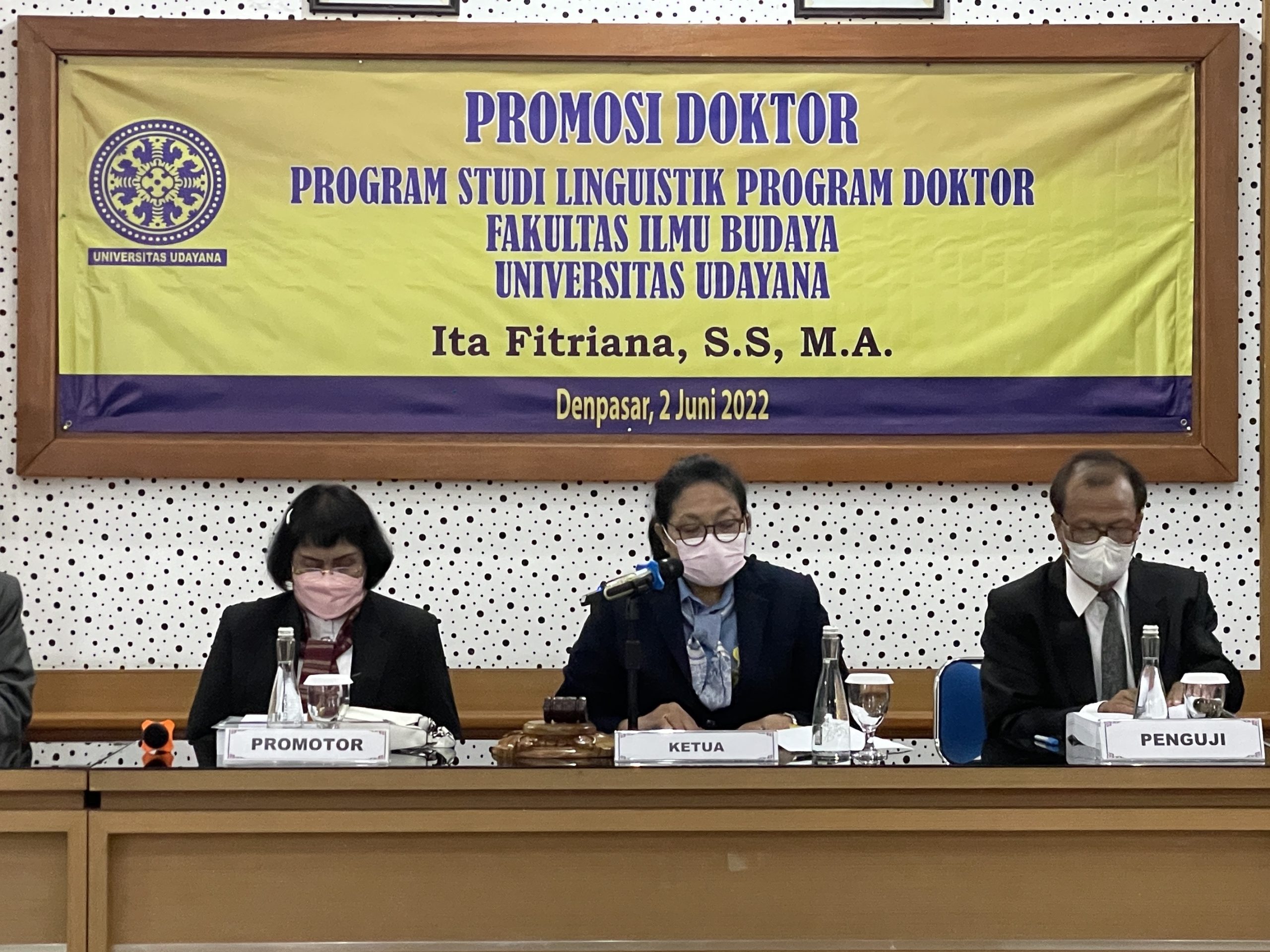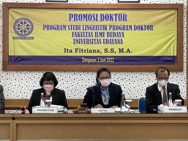 Program Studi Linguistik Program Doktor, Fakultas Ilmu Budaya, Universitas Udayana kembali menyelenggarakan Promosi Doktor dengan promovenda Ita Fitriana pada Kamis, 2 Juni 2022 secara hybrid di ruang Dr. Ir. Soekarno, Gedung Poerbatjaraka, FIB Unud.