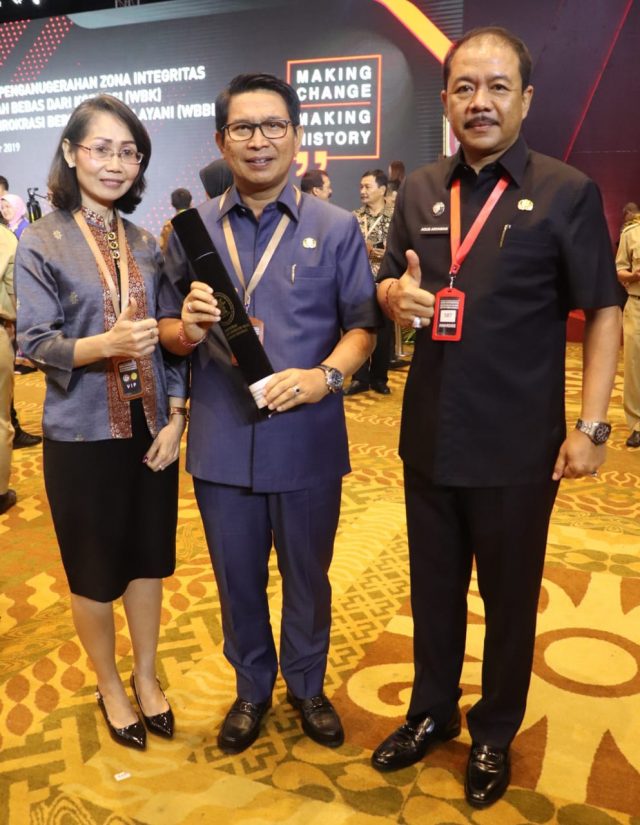 Komitmen Pemerintah Kabupaten Badung melalui Dinas Penanaman Modal dan Pelayanan Satu Pintu (DPMPTSP) dalam memberikan pelayanan prima khususnya perijinan yang bebas dari KKN dan pungli mendapatkan pengakuan dan penghargaan dari Kementerian Pendayagunaan Aparatur Negara dan Reformasi Birokrasi (KemenPAN-RB) sebagai unit kerja pelayanan berpredikat Wilayah Bebas dari Korupsi (WBK). Penghargaan diserahkan MenPAN-RB Tjahjo Kumolo kepada Kepala DPMPTSP I Made Agus Aryawan pada Apresiasi Penganugerahan Zona Integritas yang diselenggarakan KemenPAN-RB di Hotel Bidakara, Jakarta Selatan, Selasa (10/12). Turut hadir pada kesempatan tersebut Sekretaris Daerah Kabupaten Badung I Wayan Adi Arnawa dan Inspektur Luh Suryaniti.