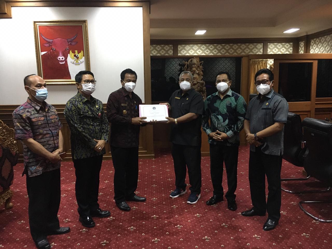 Penjabat Sementara (Pjs) Bupati Badung I Ketut Lihadnyana menyerahkan Rancangan Anggaran Pendapatan dan Belanja Daerah (RAPBD) tahun 2021 ke DPRD Badung, Selasa (20/10/2020) di Gedung Dewan Badung. RAPBD tahun 2021 diterima langsung oleh Ketua DPRD Badung Dr. Drs. I Putu Parwata MK, M.M. didampingi wakilnya I Wayan Suyasa, S.H. dan I Made Sunarta.