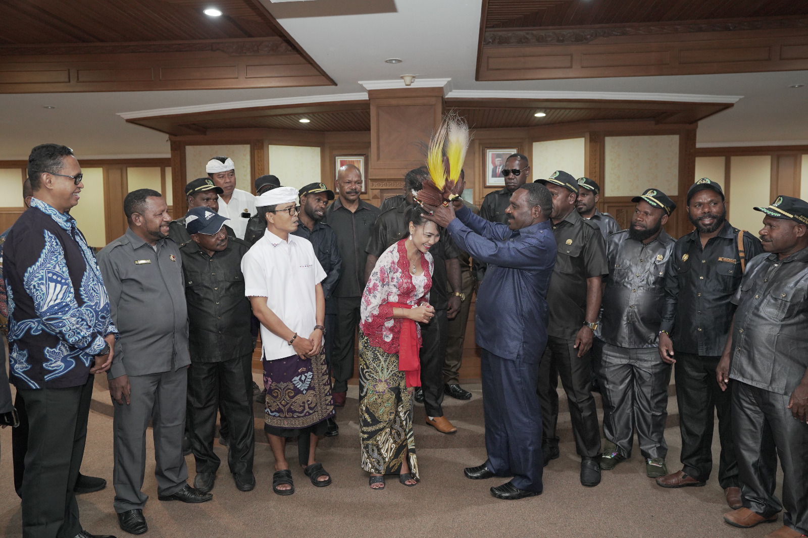 CENDERAMATA – Anggota DPRD Badung Inda Trimafo Yudha menerima cenderamata dari Ketua DPRD Kabupaten Puncak, Provinsi Papua Tengah, Kamis (14/9/2023).