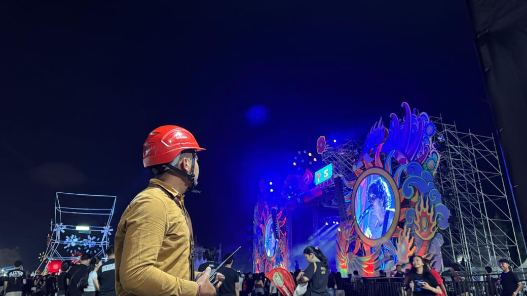 PICA FEST – Petugas PLN ikut menikmati suasana gempita panggung utama PICA Fest yang dipadati penonton sembari tetap memprioritaskan tugasnya agar kontinyuitas kelistrikan pada kegiatan tersebut tetap terjaga.