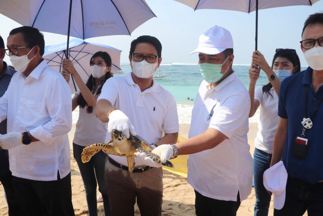 Dalam rangka menjaga keasrian dan kelestarian ekosistem laut serta pemulihan pariwisata dan pemulihan ekonomi di wilayah Bali khususnya di Kabupaten Badung, Sekretaris Daerah Kabupaten Badung I Wayan Adi Arnawa bersama Direktur Utama Bank BTN Koesmahargyo dan anggota DPR RI Komisi XI Eriko Sotarduga melakukan penanaman terumbu karang dan pelepasan tukik di kawasan Pantai Nusa Dua Kuta Selatan, Sabtu (10/4). Acara yang digelar serangkaian Hari Ulang Tahun ke-71 Bank Tabungan Negara (BTN) ini juga dihadiri Direktur Nusa Dua Reef Foundation Pariama Hutasoit, Ketua DPD REI Bali I Gede Suardita, Ketua Himpera Bali I Wayan Jayantara, Sekretaris Dinas Pariwisata Badung AA Yuyun Hanura Eny serta undangan lainnya.