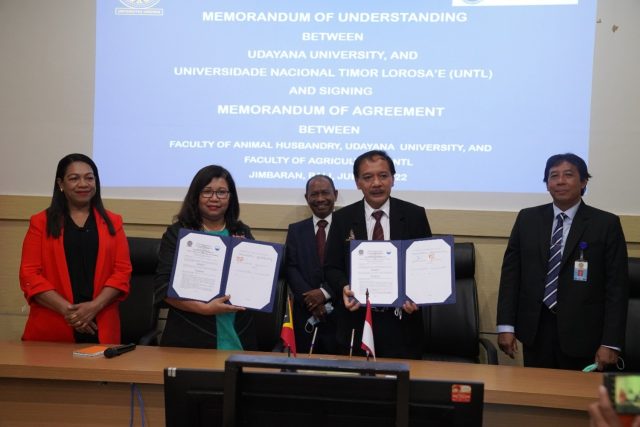 Fakultas Peternakan Universitas Udayana melaksanakan penandatanganan perjanjian kerja sama (PKS) dengan Fakultas Pertanian Universidade Nacional Timor Lorosa’e (UNTL) bertempat di Ruang Nusa Gedung Rektorat Kampus Bukit Jimbaran, Senin, 11 Juli 2022.