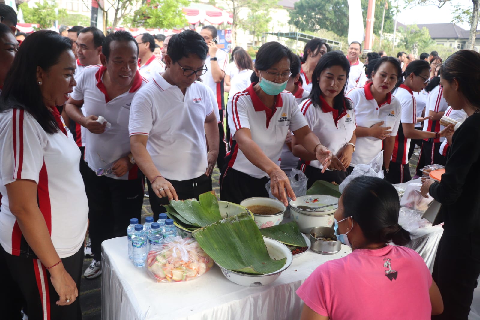 Pemerintah Kabupaten Badung kembali menggelar kegiatan Jumat Ceria Bersama UMKM Badung yang dipusatkan di kawasan Pusat Pemerintahan Kabupaten Badung, Mangupraja Mandala, Jumat (31/3). Acara yang dikemas dalam bentuk krida senam bersama dan pameran produk UMKM ini dihadiri oleh Sekda Badung I Wayan Adi Arnawa bersama para pejabat, organisasi kewanitaan dan pegawai di lingkungan Pemkab Badung. Kegiatan ini rutin dilaksanakan setiap bulan sekali ini dalam upaya memfasilitasi pemasaran produk UMKM di Kabupaten Badung.