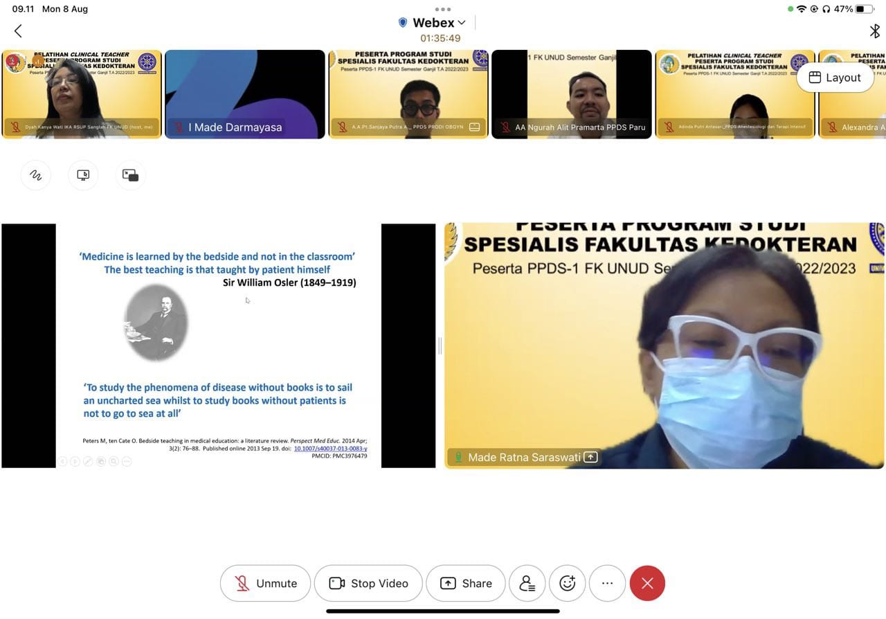 Pelatihan ini dilaksanakan secara daring selama 1 (satu) hari pada Senin (8/8/2022) dengan memberikan materi meliputi Kompetensi dokter Indonesia, Role Model, Microskill Teaching, Bed Side Teaching, Case Based Discussion, Mini C-EX, Direct Observation Procedural Skill (DOPS), dan Multi Sources Feedback (MSF).