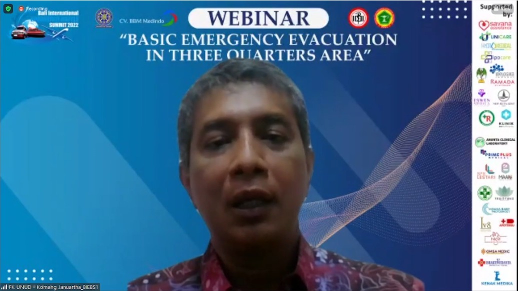 Dekan FK Unud, Dr. dr. Komang Januartha Putra Pinatih, M.Kes., dalam sambutannya menyampaikan sangat mengapresiasi kegiatan yang diselenggarakan oleh BBM Medindo ini dalam rangka mendukung dan menyukseskan acara G20 dengan memberikan ilmu mengenai kasus evakuasi darurat di darat, air dan udara.