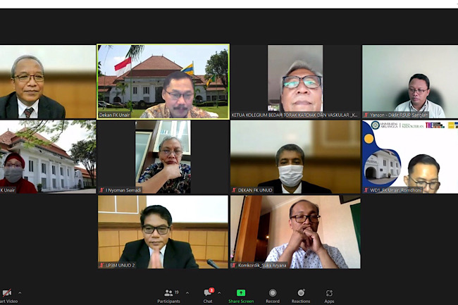 Pertemuan ini diselenggarakan terkait usulan pengampu prodi spesialis BTKV di FK Unud-RSUP Sanglah oleh Fakultas Kedokteran Unair, dan pada kesempatan ini Dekan FK Unair, Prof. Dr. dr. Budi Santoso, Sp.OG (K) turut hadir langsung secara daring.