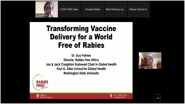 Fakultas Kedokteran Hewan Universitas Udayana mengadakan public lecture dengan topik “The Role of Veterinary Medicine in Global Health” oleh Prof. Guy H. Palmer dari School for Global Animal Health, Washington State University, Jumat (19/5/2023) secara daring dengan platform webex meeting. Kuliah terbuka ini dihadiri oleh Dekan Fakultas Kedokteran Hewan Universitas Udayana, para dosen, serta para mahasiswa baik tingkat sarjana maupun mahasiswa pendidikan profesi dokter hewan.
