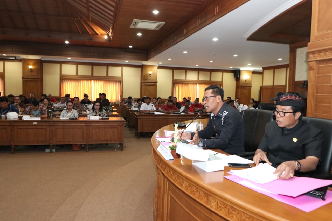 SERAP ASPIRASI – Wakil Ketua II DPRD Badung Made Sunarta didampingi Ketua Pansus penyelenggaraan parkir Made Ponda Wirawan memimpin rapat serap aspirasi dari masyarakat.