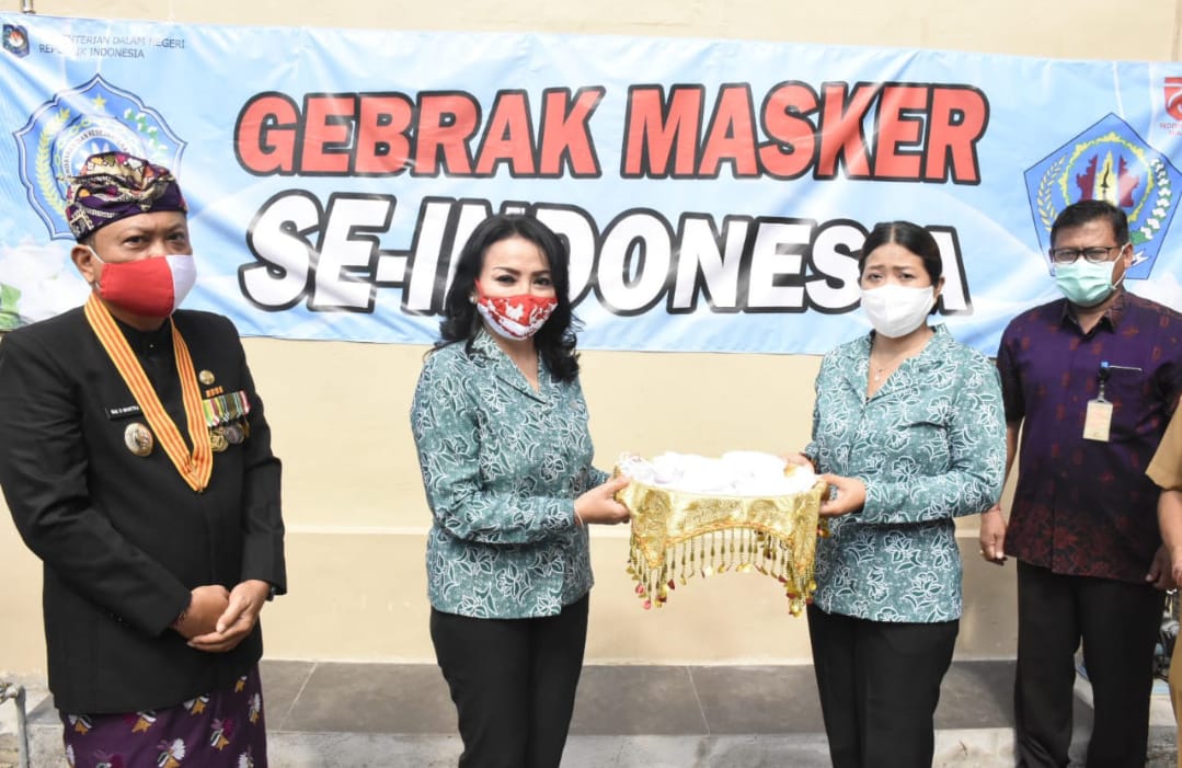 MASKER – Pada Senin (17/8) secara simbolis diserahkan ribuan masker melalui program PKK “Gebrak Masker” kepada masyarakat oleh Walikota IB Rai Dharmawijaya Mantra bersama Ketua TP PKK Kota Denpasar IA Selly Dharmawija Mantra.