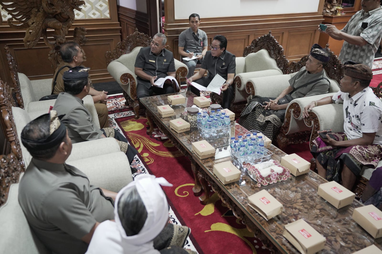 PADUDUSAN AGUNG – Ketua DPRD Badung Putu Parwata didampingi Wakil Ketua II Made Sunarta menerima prajuru serta prawartaka Karya Padudusan Agung Desa Adat Ayunan, Senin (7/8/2023).