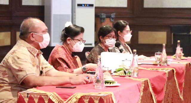 PAMERAN – Ketua Dekranasda Bali Ny. Putri Suastini Koster saat menghadiri technical meeting Pameran Bali Bangkit II, di Ksirarnawa, Selasa (20/4).