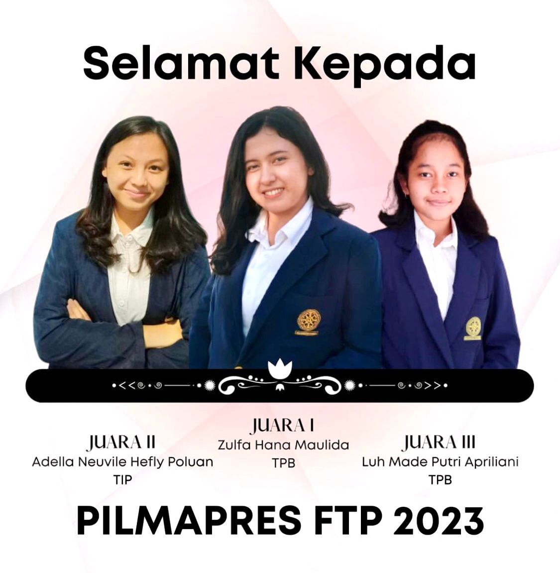Dalam proses pemilihan mahasiswa berprestasi yang sangat ketat ini terpilih Zulfa Hana Maulida dari Program Studi Teknik Pertanian dan Biosistem sebagai Juara I Mahasiswa Berprestasi FTP Unud yang nantinya akan mewakili FTP Unud dalam ajang Pemilihan Mahasiswa Berprestasi di jenjang Universitas. Selain itu Juara II diraih oleh Adella Neuvile Hefly Poluan dari Program Studi Teknologi Industri Pertanian dan Juara III diraih oleh Luh Made Putri Apriliani dari Program Studi Teknik Pertanian dan Biosistem. (sar/jubir-unud)
