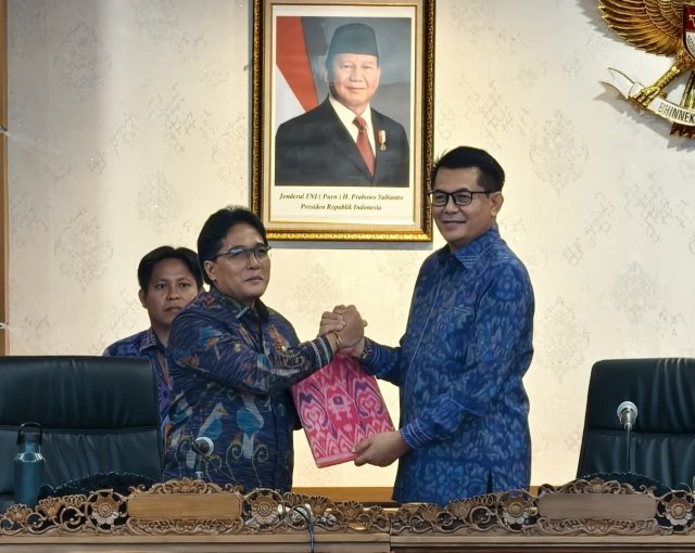 CATATAN REKOMENDASI – Ketua DPRD Bali Dewa Made Mahayadnya (kanan) menyerahkan catatan rekomendasi DPRD Bali terhadap LKPJ Kepala Daerah kepada Wagub Bali Nyoman Giri Prasta dalam rapat paripurna ke-35, Jumat (24/4/2026).