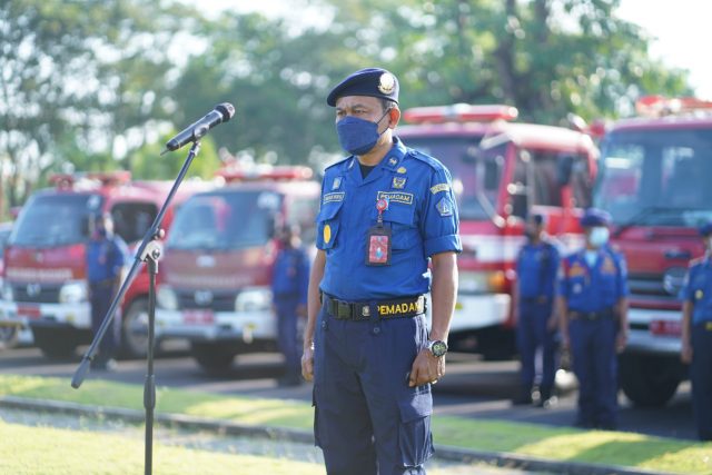 GELAR PASUKAN – Dinas Kebakaran dan Penyelamatan Kabupaten Badung melaksanakan apel gelar pasukan dalam rangka antisipasi KTT G-20, bertempat di Halaman depan Balai Budaya Giri Nata Mandala Puspem Badung, Senin (7/2).