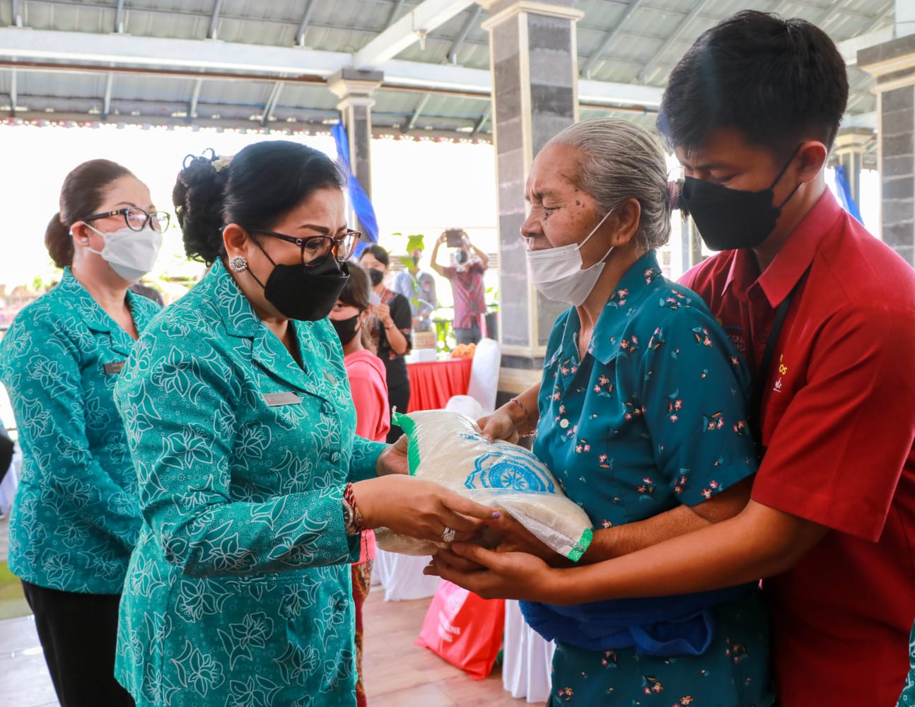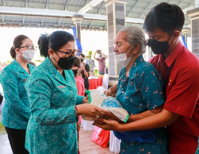 BANTUAN – Ketua TP PKK Bali Ny. Putri Koster menyerahkan bantuan saat menyapa dan berbagi di Tabanan, Sabtu (21/5/2022).