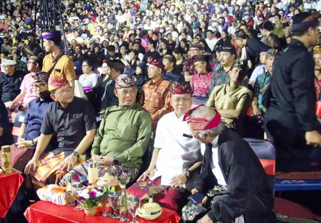 Di tengah dentingan gamelan yang menggema, hadir Gubernur Bali Wayan Koster, yang tampak duduk khusyuk menyaksikan pertunjukan hingga akhir acara. Ia tak sendiri. Tampak pula mendampingi sejumlah tokoh penting, seperti Bupati Badung Wayan Adi Arnawa, Bupati Buleleng Nyoman Sutjidra, Ketua DPRD Gianyar Ketut Sudarsana, serta Danrem 163/Wirasatya.