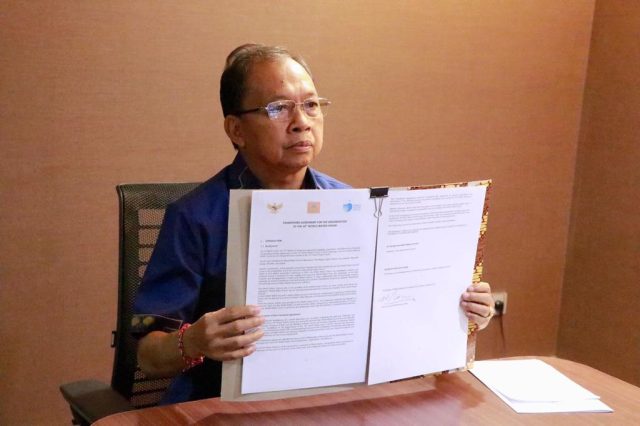 WWF X – Gubernur Wayan Koster memperlihatkan Perjanjian Kerangka Kerja World Water Forum (WWF) ke-10 Tahun 2024.