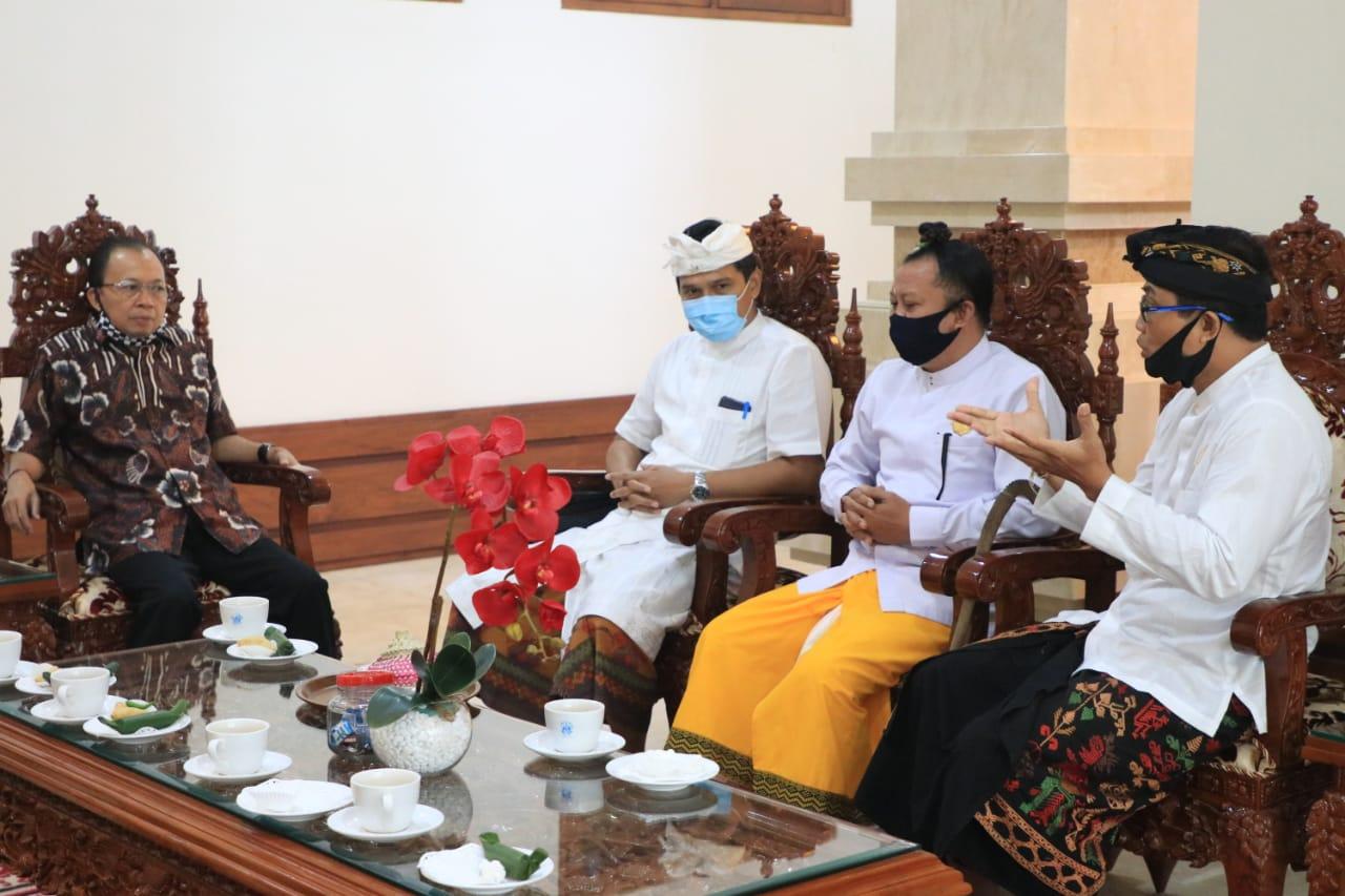 SANTHI PUJA – Gubernur Wayan Koster saat menerima Panitia Pelaksana Santhi Puja Samgraha, di Rumah Jabatan Jayasabha Denpasar pada Minggu (28/6) pagi.