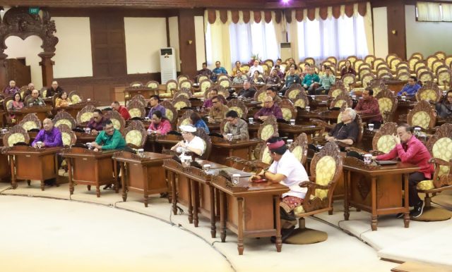 PENJELASAN – Gubernur Bali wayan Koster dihadapan rapat paripurna DPRD Bali untuk memberi penjelasan mengenai tiga raperda. Salah staunya tentang Kontribusi Pelindungan Kebudayaan dan Lingkungan Alam Bali dari Sumber Lain yang Sah dan Tidak Mengikat.