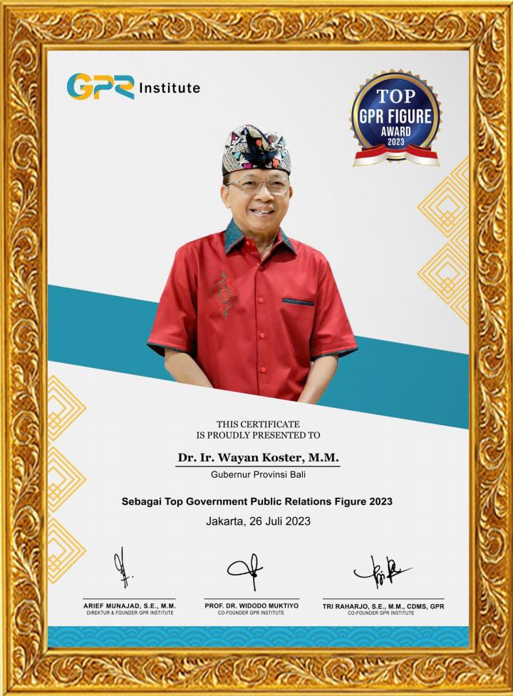Untuk itulah atas prestasi kerja fokus, tulus, dan lurus yang dilakukan Murdaning Jagat Bali asal Desa Sembiran, Buleleng ini, GPR Institute menganugerahi , Gubernur Bali, Wayan Koster penghargaan sebagai Top Government Public Relations Figure 2023. GPR Institute juga memberikan penghargaan yang sama kepada : 1) Menteri Pariwisata dan Ekonomi Kreatif RI, Sandiaga Solahuddin Uno; 2) Menteri Keuangan RI, Sri Mulyani Indrawati; 3) Gubernur Jawa Tengah, Ganjar Pranowo; 4) Kementerian Komunikasi dan Informatika RI; 5) Kementerian Kesehatan RI; 6) Kementerian Agama RI; 7) Kementerian Pendidikan, Kebudayaan, Riset, dan Teknologi RI; 8) Kementerian Kelautan dan Perikanan RI; 9) Badan Narkotika Nasional; 10) Pemerintah Kabupaten Jayapura; 11) Pemerintah Kabupaten Sleman; dan 12) Pemerintah Kabupaten Indramayu.