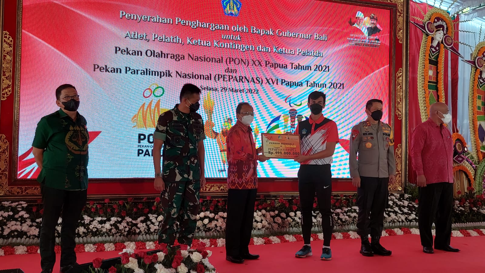 Sebagai bentuk apresiasi kepada para atlet yang berprestasi peraih medali di PON XX dan Perpanas XVI tahun 2021 di Papua sehingga Bali berhasil menduduki peringkat kelima dari 34 provinsi, Gubernur Bali Wayan Koster menyerahkan bonus. Selain kepada atlet, bonus juga diberikan kepada pelatih, ketua kontingen dan ketua pelatda.