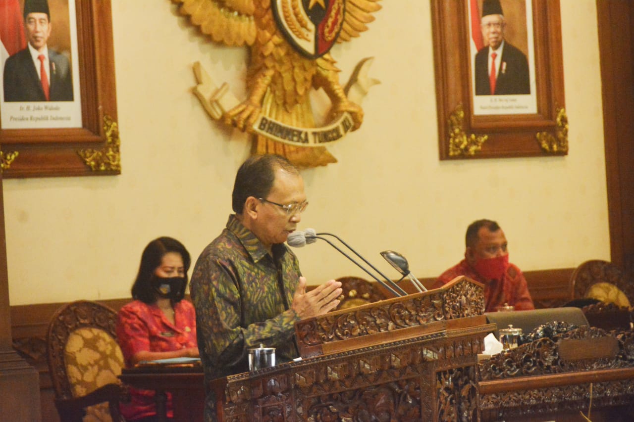 Demikian terungkap dalam Rapat Paripurna ke-11 DPRD Provinsi Bali dengan agenda Penyampaian Penjelasan Kepala Daerah terhadap tiga ranperda yang berlangsung di Ruang Sidang Utama Kantor DPRD Provinsi Bali, Renon, Denpasar, Rabu (5/8). Adapun ketiga ranperda itu adalah Raperda tentang Perubahan Atas Peraturan Daerah Nomor 11 Tahun 2019 tentang Anggaran Pendapatan Dan Belanja Daerah Semesta Berencana Provinsi Bali Tahun Anggaran 2020, Raperda tentang Rencana Zonasi Wilayah Pesisir dan Pulau-Pulau Kecil (RZWP3K) Provinsi Bali Tahun 2020-2040 dan Raperda tentang Perubahan Kedua Atas Peraturan Daerah Nomor 2 Tahun 2011 tentang Retribusi Jasa Umum.