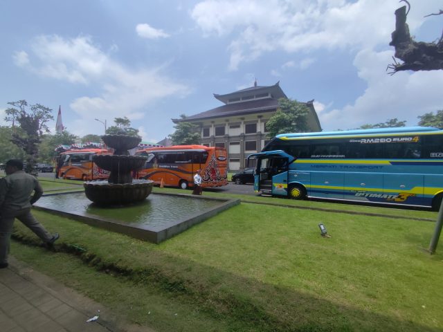 GUNAKAN BUS – Peserta rakor dari kabupaten/kota menggunakan bus sehingga lebih hemat dan mengurangi kemacetan, Rabu (12/3/2025).